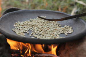 The brewing process may be different from any you’ve seen before. First, green (unroasted) coffee beans are carefully browned in a shallow pan over a flame, followed grounding by hand with a mortar and pestle style contraption. The grounds are then boiled with hot water in a clay pot called a jebena, and served in tiny cups, typically alongside freshly popped popcorn. Often the grounds are brewed three times and enjoyed over lovely conversation with friends/family and neighbours.
